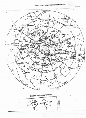 בסדרה אחת מפה שחורה, בה מסומן בקו מרוסק הגבול הרשמי בין 88 קבוצות הכוכבים, ובתוך הקבוצות מסומנות כמה כוכבים באותיות יוניות לפי בהירותם (הכוכב הבהיר ביותר בקבוצה מסומן אלפא, וכן הלאה). במקום שמות לועזיים סומנו שמות עבריים, וכן מספרים המתחילים בקוטב השמימי הצפוני ומסתימים בקוטב השמימי הדרומי. כדי לראות את פרטי המפה יש להגדילה.