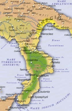 בדרום איטליה התיישבו בקצה ה"מגף" האיטלקי, באזור המכונה מַגְנָה גְרֵצִ'יָה (Magna Grecia)[7]