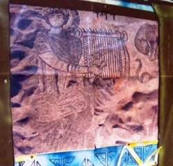 הפסיפס שנמצא בבית הכנסת בעזה, שעליו דמותו של דוד המלך מוצג במוזיאון הפסיפסיים במעלה אדומים.
