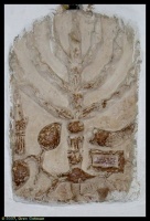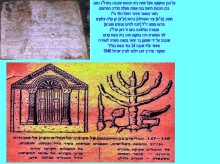 על שני לוחות האבן ישנם תבליטים. באחד תבליט של מנורה, למרגלותיה של המנורה שופר ומחתה מצדה האחד ולולב מצדה השני. על לוח האבן השני ישנו תבלטי של שער מפואר , לצד השער שני עמודים ומעליהם מעין קונכייה. מקובל להניח שהתבליט מתאר ארון קודש. שני לוחות האבן מוצגים בבית הכנסת העתיק של פקיעין.